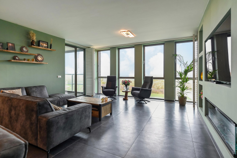 Vanuit de hal kom je in de ruime en lichte zitkamer, mede door de grote raampartijen, welke een oppervlakte van heeft circa 28m² en een balkon aan de Noord/Westzijde.